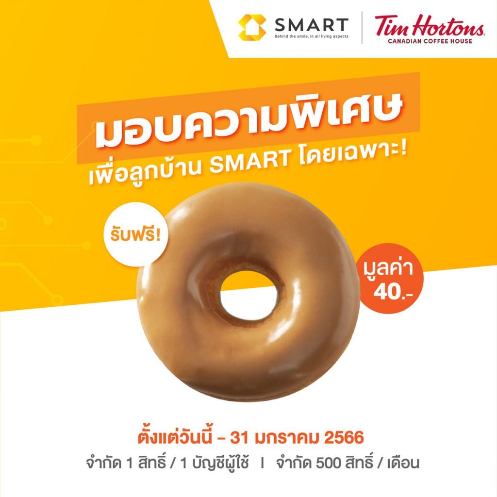 รับฟรี! Maple Dip Donut จำนวน 1 ชิ้น แค่โชว์สิทธิ์จาก App SMART WORLD และแอดไลน์รับได้ที่ Tim Hortons ทุกสาขา