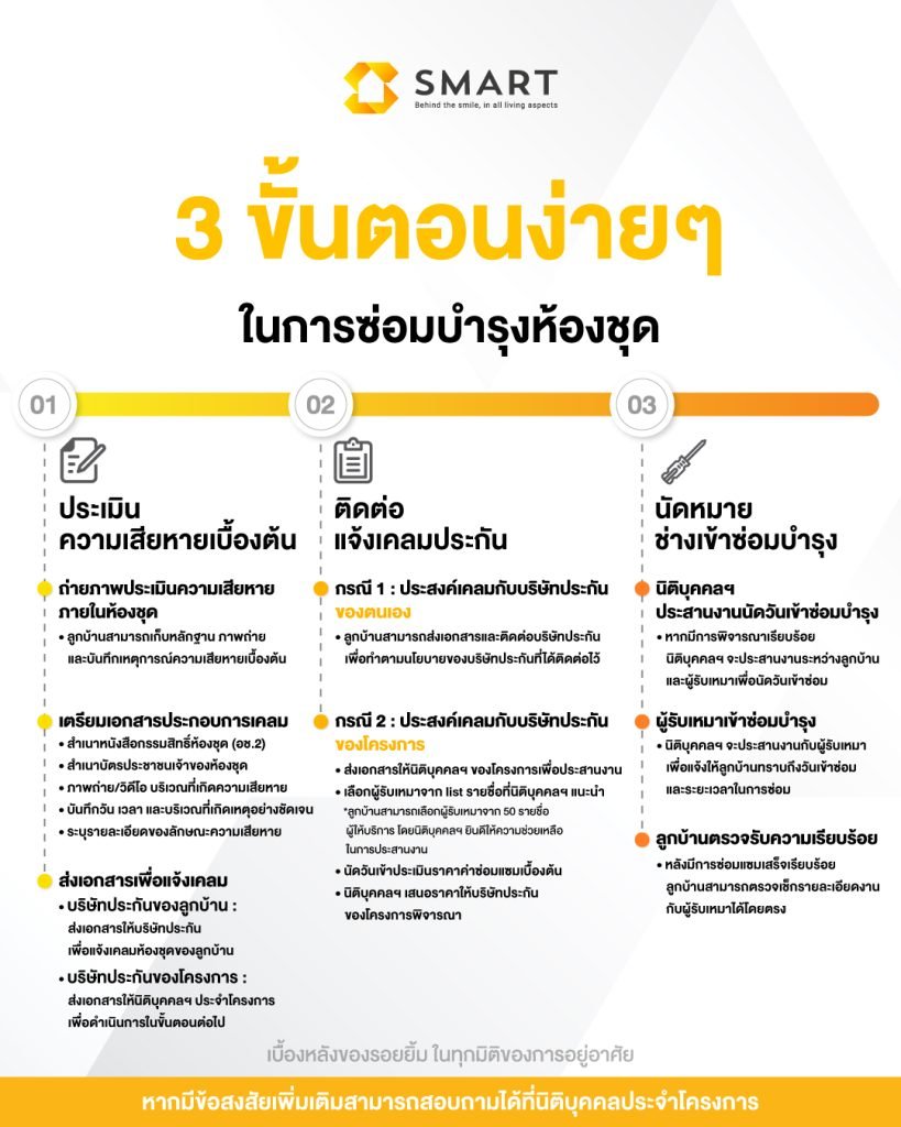 - บริษัทประกันของลูกบ้าน : ส่งเอกสารให้บริษัทประกันเพื่อแจ้งเคลมห้องชุดของลูกบ้าน